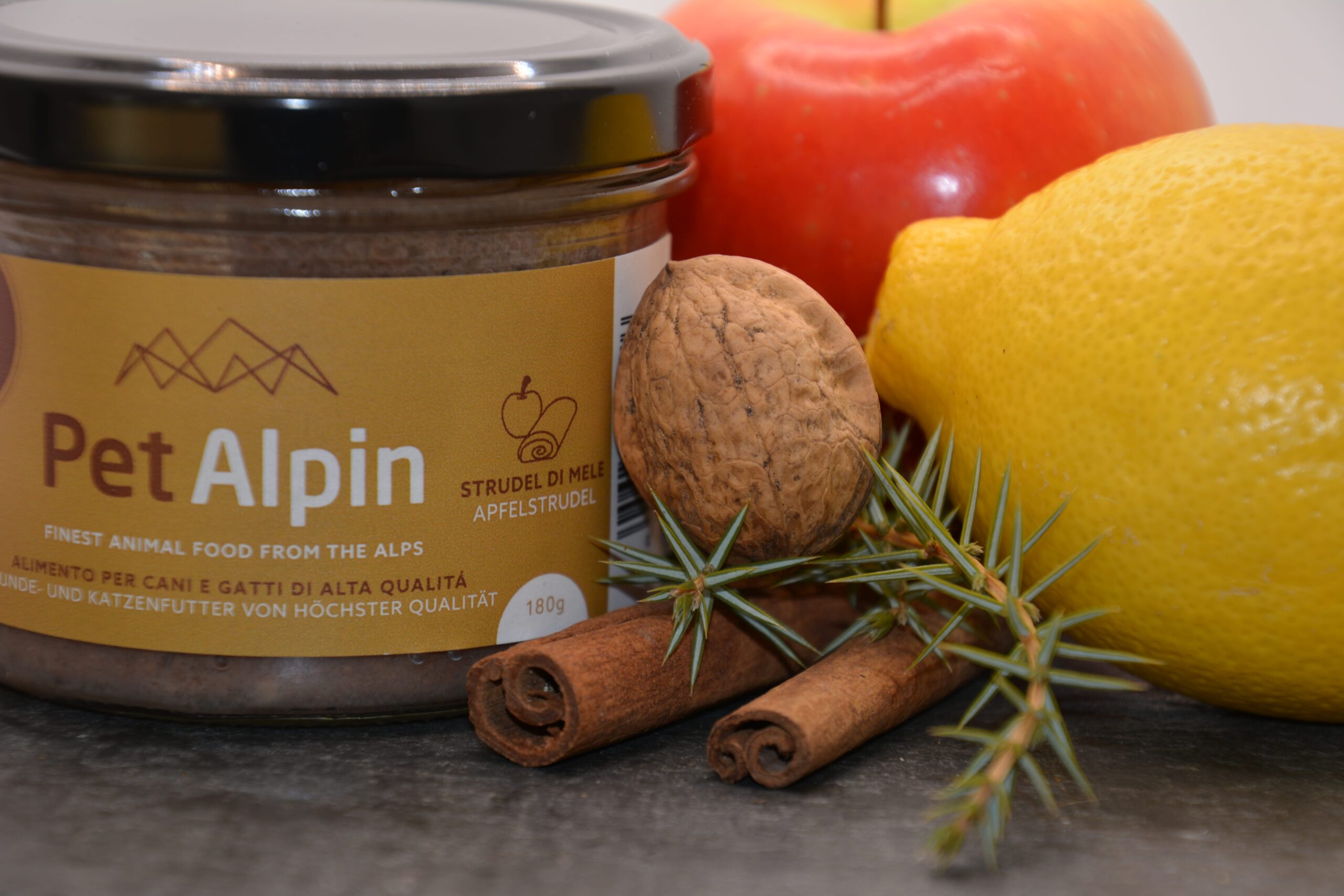 Jetzt gibt es den typischen Apfelstrudel aus Südtirol auch für Hunde und Katzen! Apfelstrudel à la PetAlpin kombiniert traditionelle Zutaten – saftige Äpfel, eine Prise Zimt, frische Zitrone und knackige Nüsse – mit hochwertigem Rindfleisch, perfekt abgestimmt auf die Bedürfnisse Ihrer Vierbeiner.